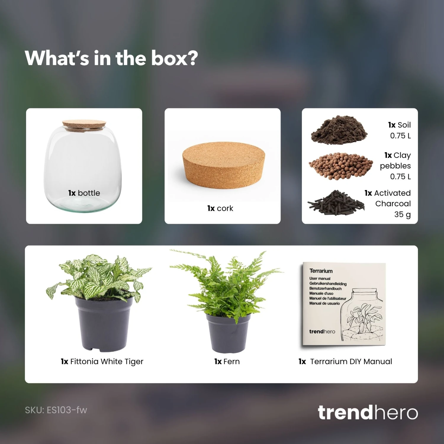 Our Do-It-Yourself (DIY) plant terrariums are delivered as a DIY kit. Upon receipt, you can easily assemble your new green friend using the included 5-step plan.